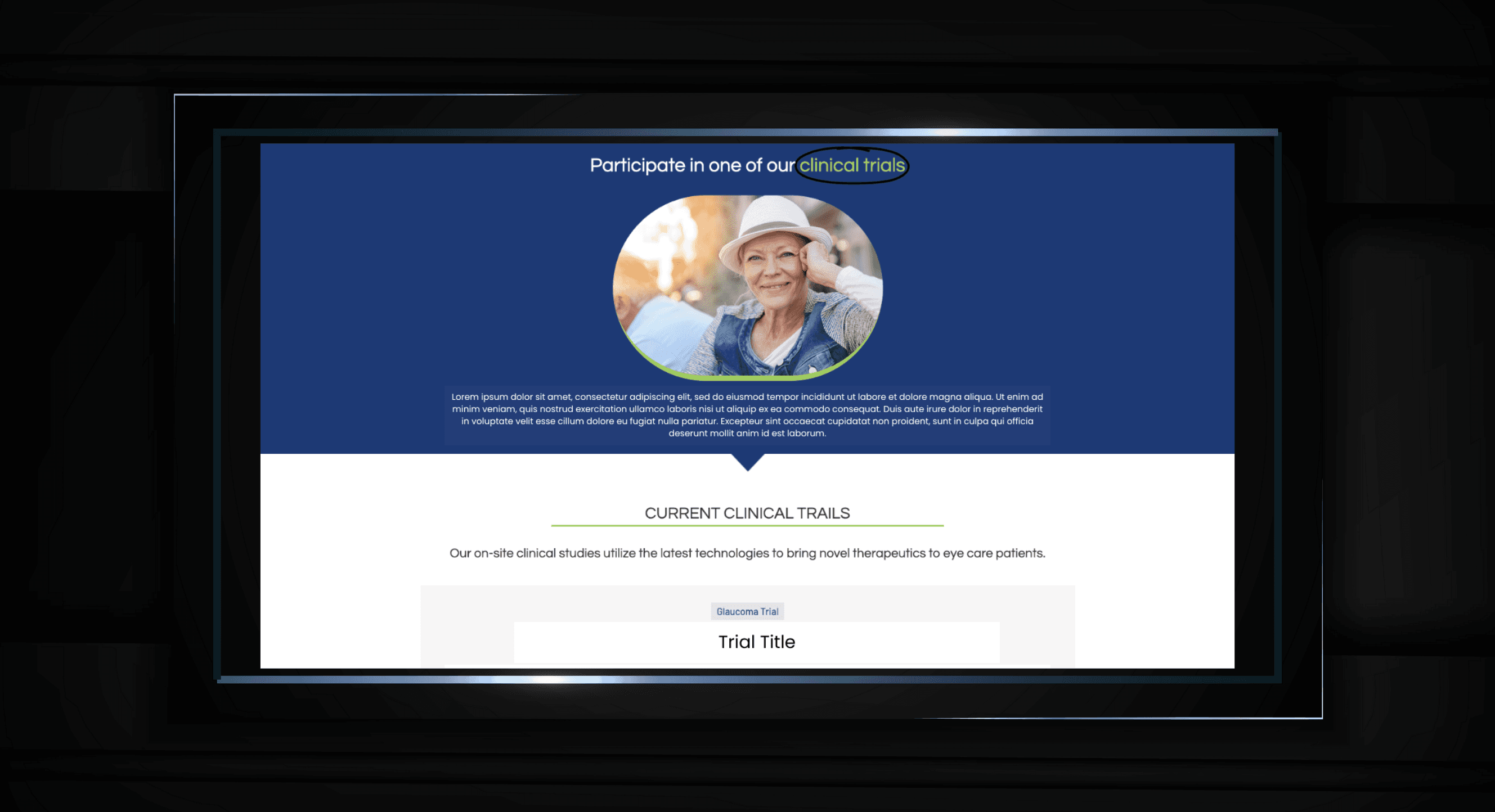 Previously, the main way to view clinical trials was via a pop-up—one that had a 0% clickthrough rate. I eliminated the pop-up and embedded static CTA links at key points: midway through the homepage, in the menu, and in the footer of the glaucoma page—ensuring visibility without frustration.