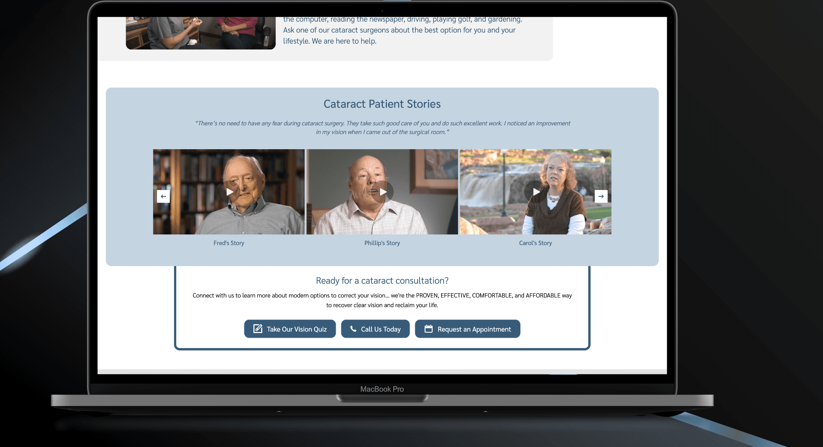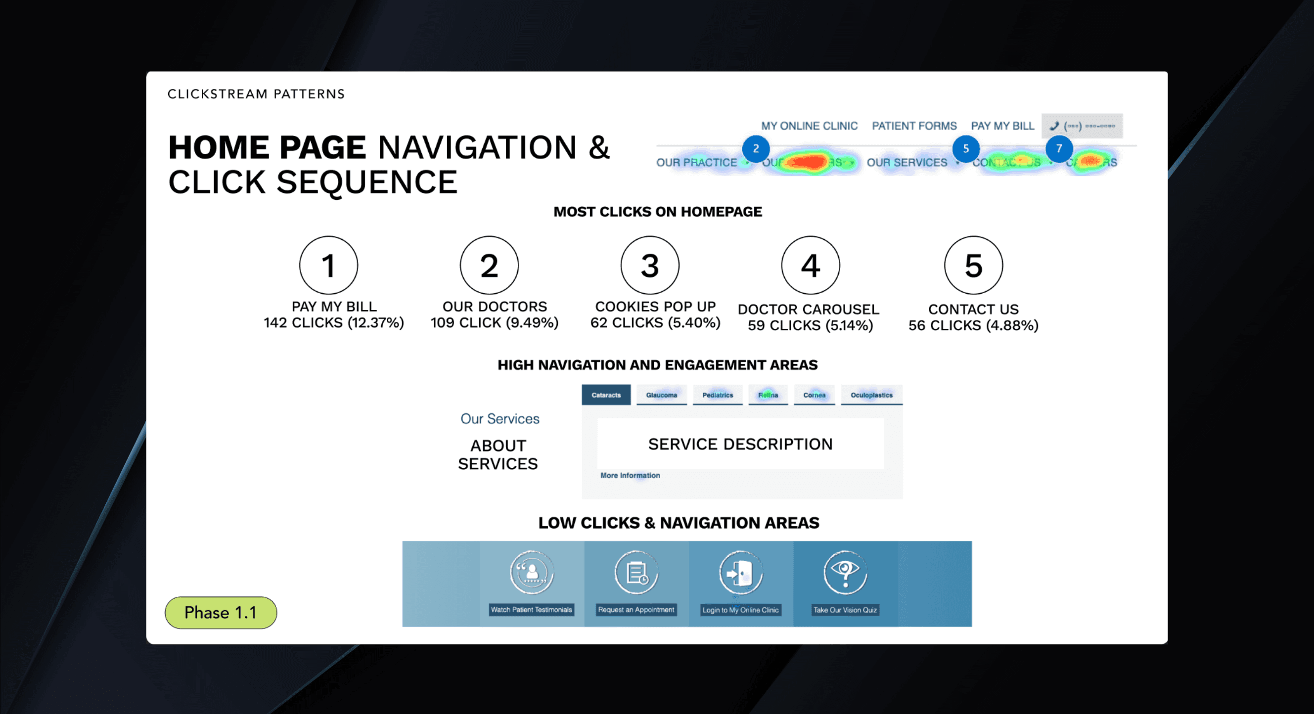 The website for a multi-specialty ophthalmic surgery practice was experiencing consistently high exit rates above the fold and a notable drop in page interaction. Excessive navigation options overwhelmed users and diluted the site’s focus, leading to poor engagement across key pages related to cataract, glaucoma, retina, cornea, and oculoplastics services.